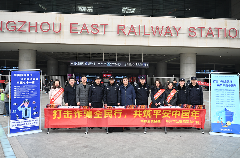 大河报·大河财立方记者李震 文 朱哲 摄影 1月15日,郑州东站西广场熙熙攘攘,归乡的游客背着大包小包,脸上满带喜悦,春节近了。当天下午,中原消费金融与郑州市公安局郑东分局联手举办的“打击诈骗全民行,共筑和谐中国年”宣传活动在郑州东站、会展中心等地点同步启动。根据公安部发布的58条常见诈骗手法,双方联合制作了预防诈骗手册,并印制了春联礼包。截至当晚,累计发放防诈骗宣传手册及春联礼包超过10000件。 当天,20余名公安干警、中原消费金融30名志愿者共同行动,向市民宣传防诈骗案例、金融基础知识和风险防范技能,提升防骗意识和金融风险意识,免受诈骗分子和违法金融活动侵害。