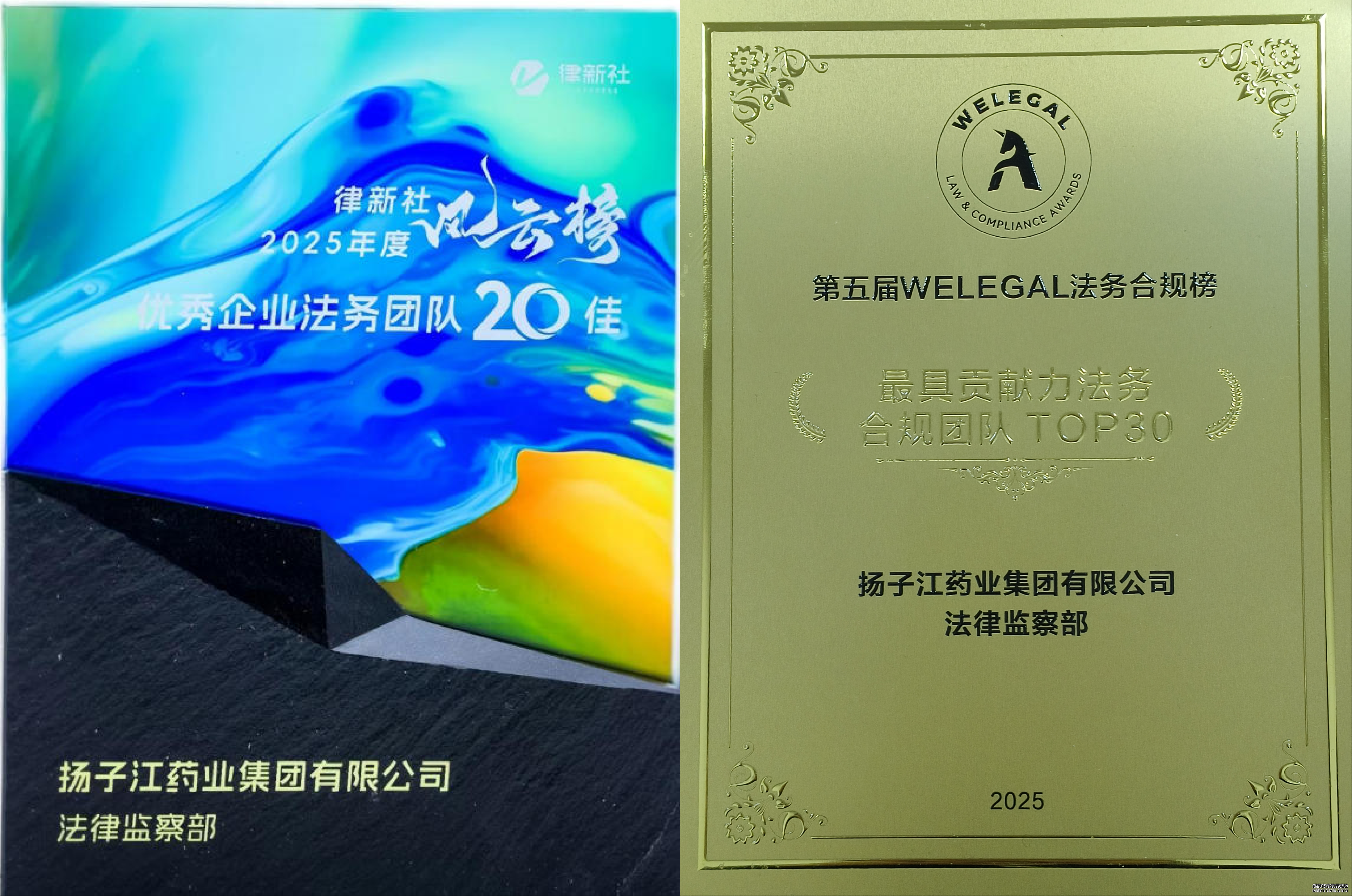 近日,扬子江药业集团接连入选律新社“2025年度优秀企业法务团队20佳”、WELEGAL法盟第五届“最具贡献力法务合规团队TOP30”。该集团法务相关负责人分获“卓越总法律顾问20佳”与“最具贡献力法总合规总TOP10”称号。扬子江药业集团在法治化治理与系统性合规建设方面的阶段性成果受到业界认可。
