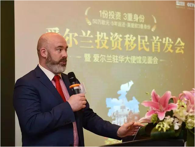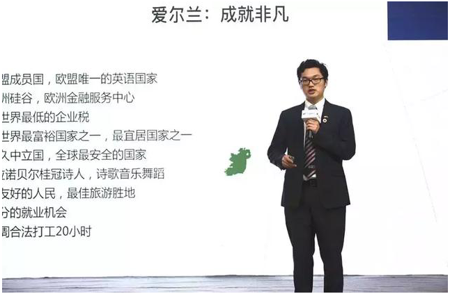 爱尔兰驻华大使馆参赞 Thomas Bellew先生在北京现场致辞 来自爱尔兰著名高校爱尔兰国立科克大学(UCC)的黄海博博士则将爱尔兰比喻为“小清新国家”——传承了优质的英式教育体系,在英国决定脱欧后,爱尔兰作为欧盟唯一一个纯英语母语国家,投资人的子女从幼儿园开始便能享受到地道的英语教学。